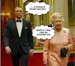 Bilden visar drottning Elisabeth och strax bakom henne James Bond (i Daniel Craigs gestalt). Bond frågar lite bekymrad: ”So Maam… Donald Trump?” Bettan ser sammanbiten ut och svarar i mungipan: ”Just make it look like an accident!”