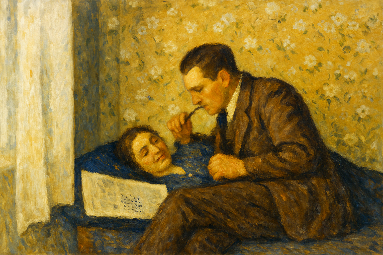 Va? Jag som använde ordet boudoirstämning härförleden! Jag håller på att digitalisera min morfars fotosamling, i alla fall de delar som finns kvar av den. De tidigaste fotona är från tidigt 20-tal och det roliga är att morfars foton ser inte alls ut som de flesta andra från den tiden, d.v.s. en hop med folk uppställda framför en stuga, gärna med en selad häst på ena sidan hopen. Han har fotat skogshuggare i timmerkojor, brunns- och dikesgrävning, bärplockning, slåtter, samiska visten med mera. Alltså folk i sysslor av olika slag. En massa foton av familjen finns det också. Det fanns i samlingen ett jättefint foto av mormor och morfar som nygifta. Mormor ligger på en säng eller soffa av något slag och morfar sitter bredvid och tittar innerligt på henne. Fast han har pipan i mungipan och en tidning med ett korsord uppslaget så är det en klar boudiorstämning på bilden. Jag gav ett kolorerat och inramat sånt i födelsedagspresent till en kusin och han frågade mej vad det var för särskilt med det. Jag tyckte att det var just stämningen som var alldeles oskyldig (dom bodde på övervåningen till ett kapell förresten) men ändå intim på nåt vis, har aldrig sett nåt liknande foto. Använde just ordet boudoirstämning. Nu lät jag chat gpt göra en målning av fotot så att det känns OK att publicera det här och se där: Det fick namnet ”intim vistelse i mjukt ljus”. Vad tycker båset om stämningen?