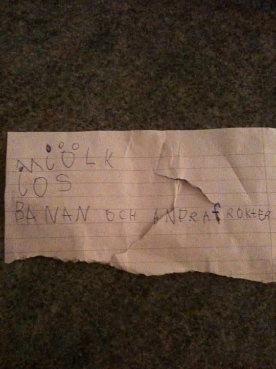 Sent ute i båset, men har en femton år gammal lapp, skriven av lillasyster, då 6 år, som skulle gå till affären alldeles själv för första gången.