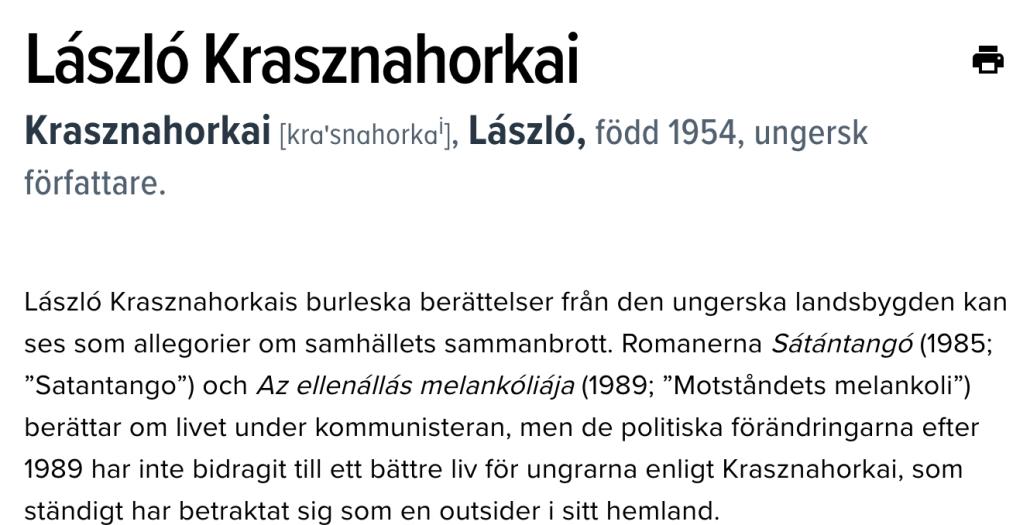 Man ska tydligen börja med ”Satantango” från 1985 om man är nyfiken. Den har även filmatiserats (sju timmar!) med en inledning på tjugo minuter där man ser kossor som inte gör något alls.