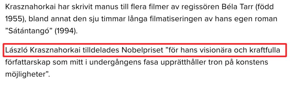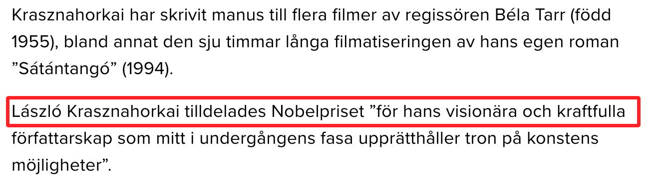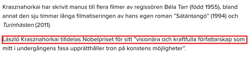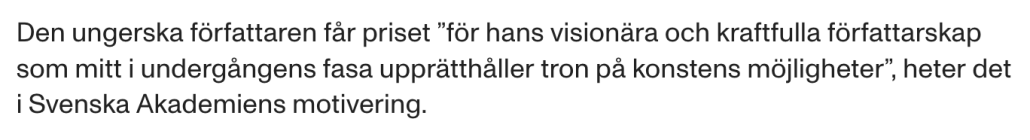 László Krasznahorkai tilldelades Nobelpriset för sitt ”visionära och kraftfulla författarskap som mitt i undergångens fasa upprätthåller tron på konstens möjligheter”.