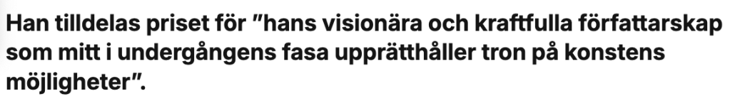 Jag kan ju inte stoppa krig eller putta bort Trump från tronen. Men jag kan fjärrstyra t.ex. Nationalencyklopedin. Efter dagens tillkännagivande om Nobelpriset i litteratur, skrev alla publikationer – inklusive NE.se – den felaktiga meningen som jag nämner här ovan.