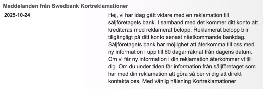 HÄR KOMMER DITT NYA KORT! tjoade Swedbank utan förvarning när jag var på väg hem från husbilsresan. Jag försökte minnas om jag hade bett om ett nytt kort, kollade om mitt nuvarande (och fungerande) kort hade gått ut, letade efter ett sätt att kommunicera med banken (tji fick jag), chattade i en halv minut med en AI som konstaterade att jag ville ha ett nytt bankkort (vilket jag inte ville) och upptäckte sedan att kortet hade slutat funka.