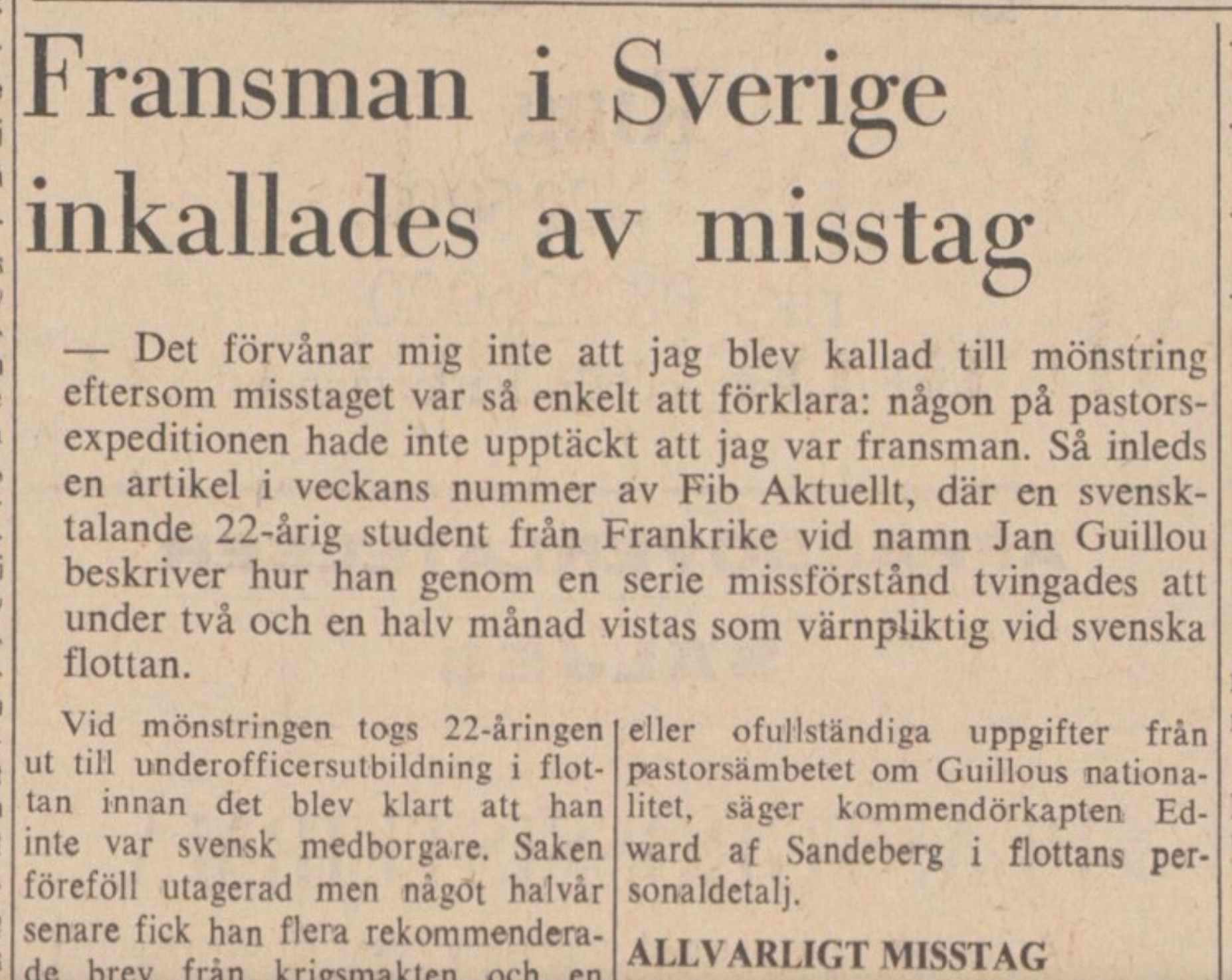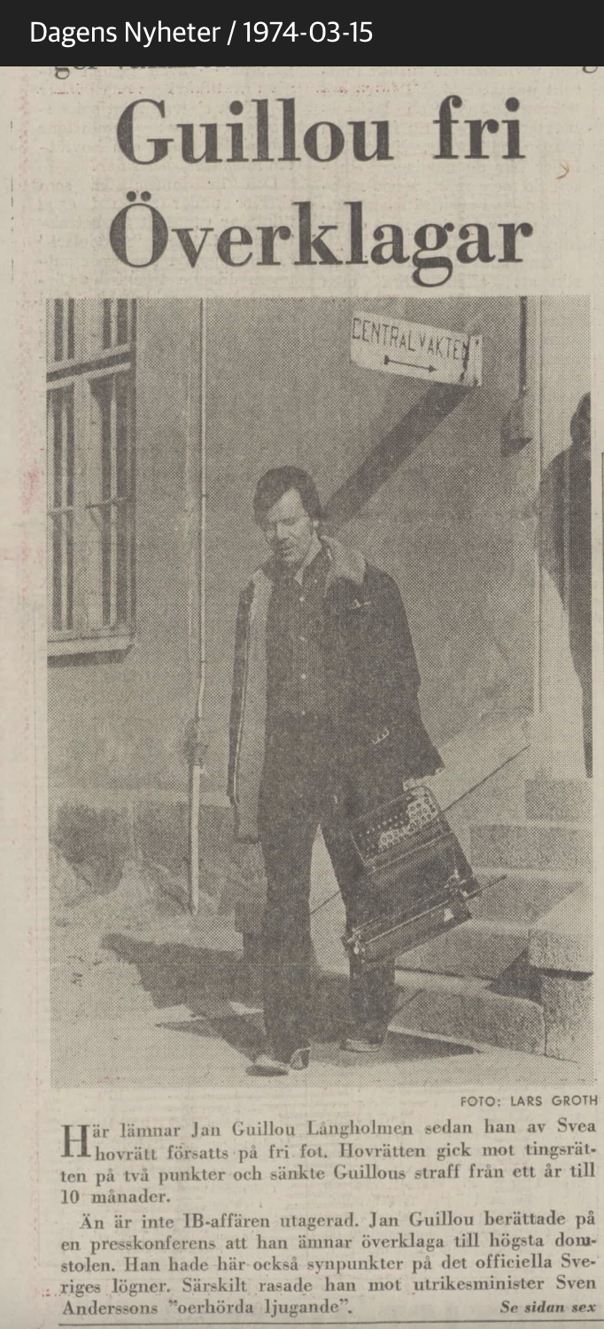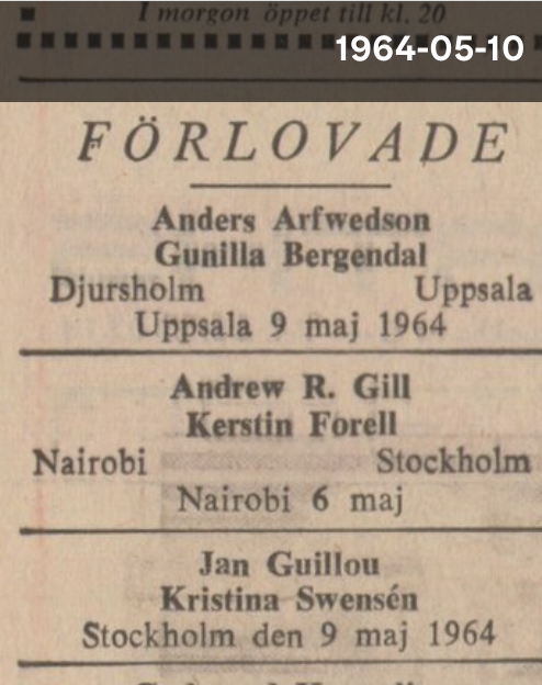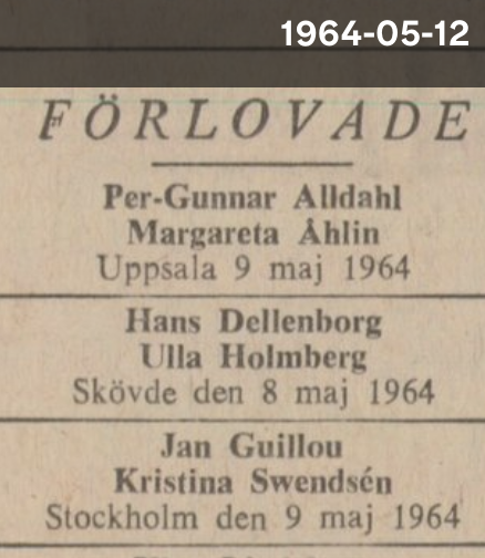 Men den skrivmaskinsknattrande Jan Guillou valsade runt i pressen redan 1964, när han tog studenten från den experimentella Viggbyholmsskolan, som var en nyhet för mig – jag som har bott i Täby och hängt i Viggbyholm och allt hade ingen aning! Först kom en förlovningsannons den 10 maj, sedan kom den 11 maj en kungörelse om vilka som hade tagit studenten och så kom ännu en förlovningsannons den 12 maj.