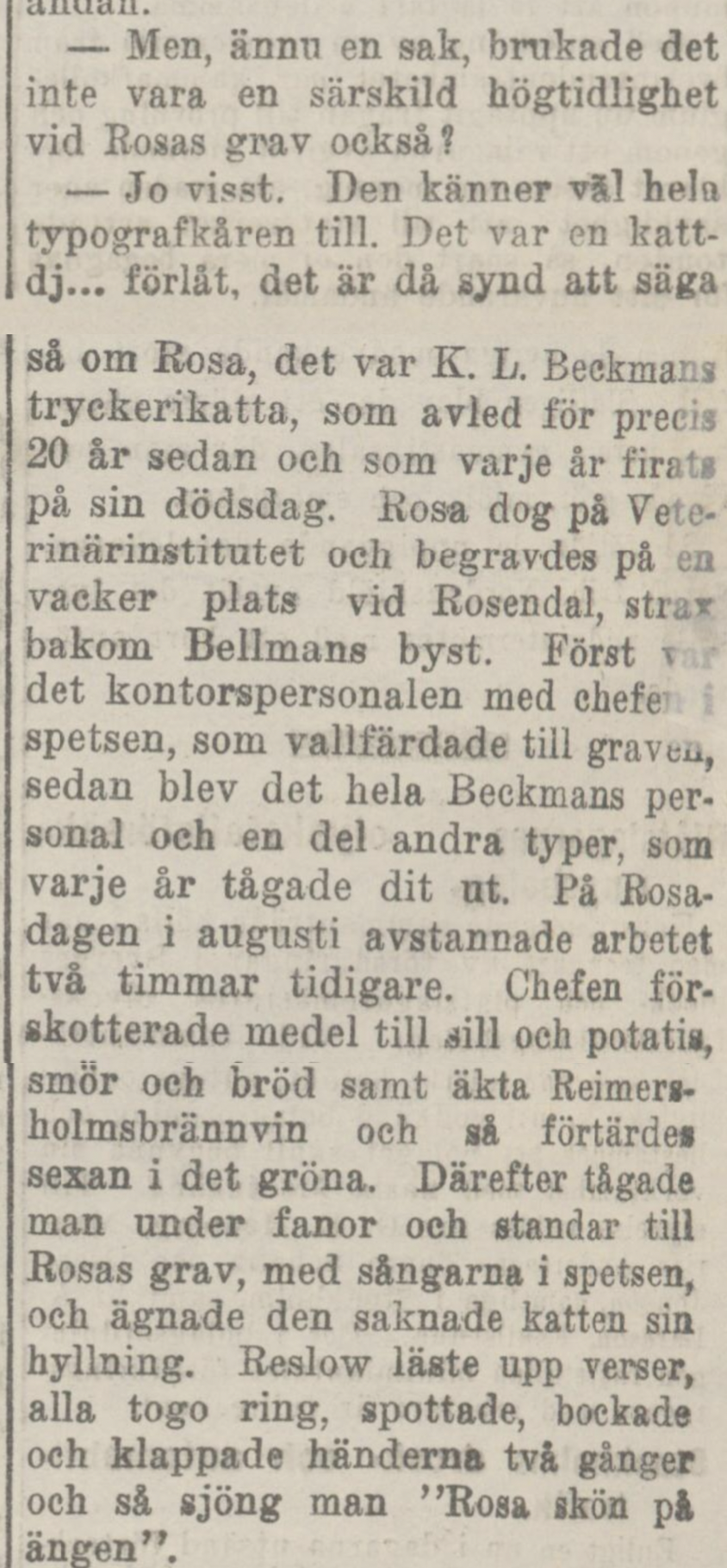 ”Bakom Bellmans byst på Djurgården begravdes katten Rosa på 1880-talet. Hon var tryckerikatt på Beckmanska boktryckeriet med anor från Lars Johan Hiertas tid och typograferna bildade ett Rosa-förbund, som varje år träffades för att högtidlighålla minnet av Rosa. Jag får sån lust att återuppliva Rosaförbundet!”