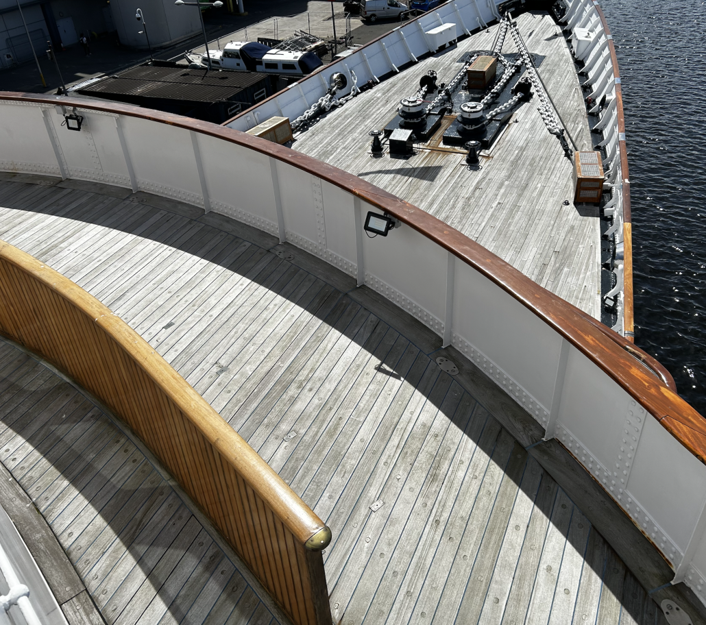 Här stod de kungliga och vinkade åt sina undersåtar. Någon gång på 1970-talet byggdes det svängda furustaketet lite längre in på däck eftersom den lilla drottningen flera gånger höll på att blåsa omkull.