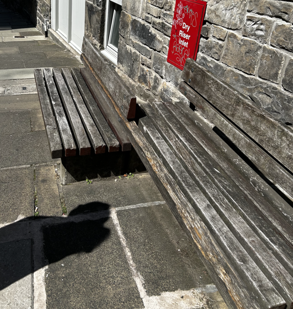 Det är nästan som en synvilla: den hitersta bänkens nedersta sittbräda övergår till att vara den bortre bänkens nedersta ryggstödsbräda!De verkar ha kul i Dean Village.